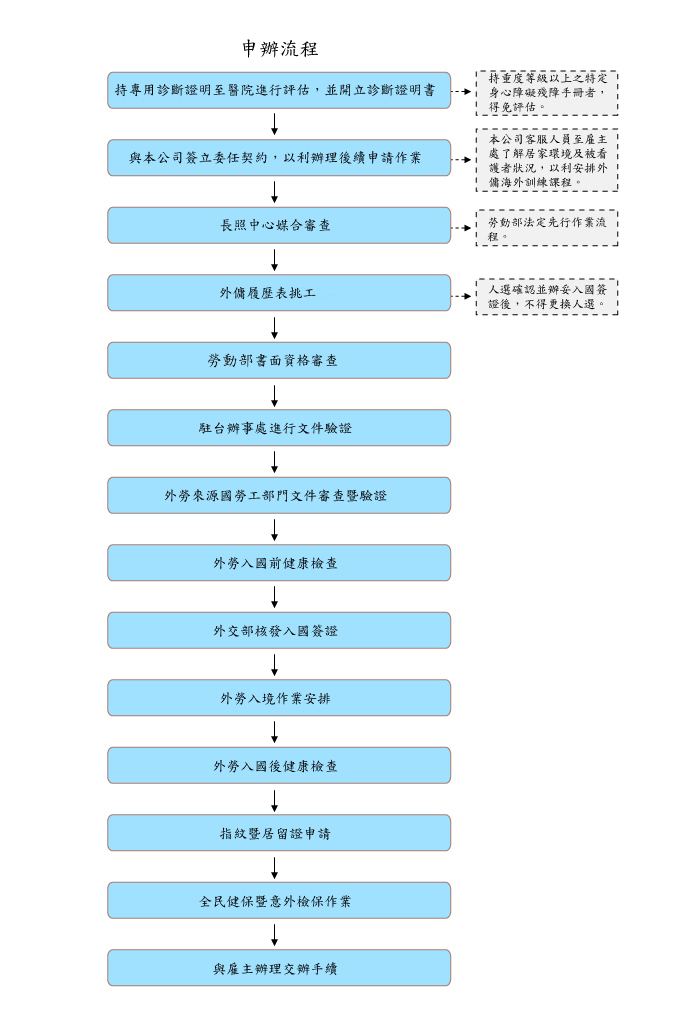 - 持聽障、視障、器障身心障礙手冊申請聘僱外籍監護工者,須接受醫療團隊照護評估。