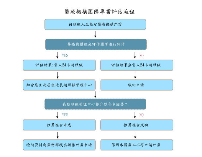 - 據上流程,得申請外籍監護工者其經醫療團隊照護評估須為『需24小時照護』。病症暨失能診斷證明書【下載】。